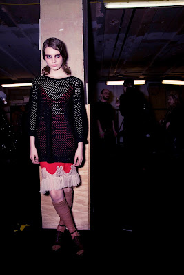 Topman design aimed to show the east Berlin "cool" boys with a punk aesthetic. All the boots were mid thigh length and many styled over the trousers. It was all about the trouser or the coat. High waisted cotton combat trousers in khaki and earthy tones ran through out the collection and a pair of long johns as outerwear, Topman design also offered ripped patchwork denim jeans towards the end of the collection.. A number of statement coats debuted including the number of Parka's, two variations of the bomber jacket in fur and nylon and a shearling coat.
